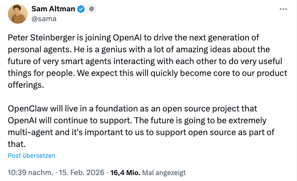 OpenClaw selbst soll als unabhängige Open-Source-Stiftung weitergeführt werden, so die öffentliche Verlautbarung.